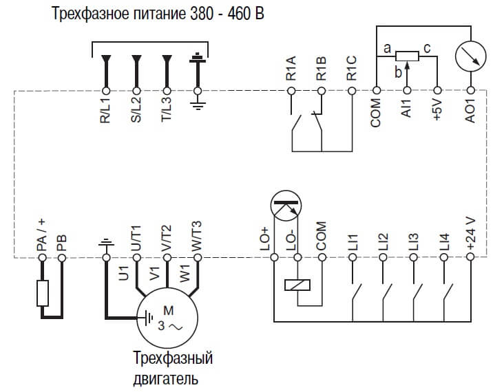 - Обеспечение защит: по току, напряжению, от потери фаз вход/выход, от перегрева преобразователя частоты;