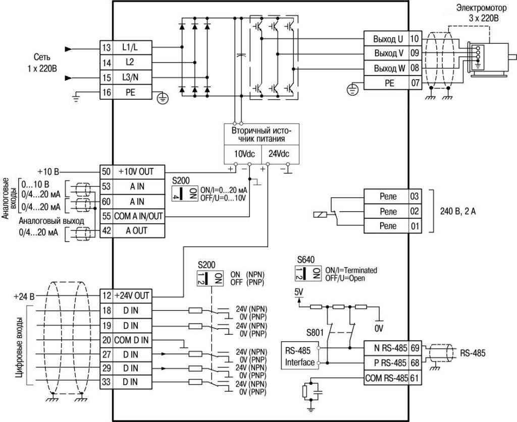 - Режимы управления электродвигателем: скалярный (U/F), векторный (VC)