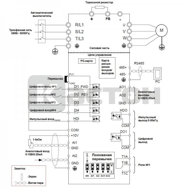 - Режимы управления электродвигателем: векторный (с датчиком обратной связи VC или без датчика обратной связи SVC) и скалярный (V/f);