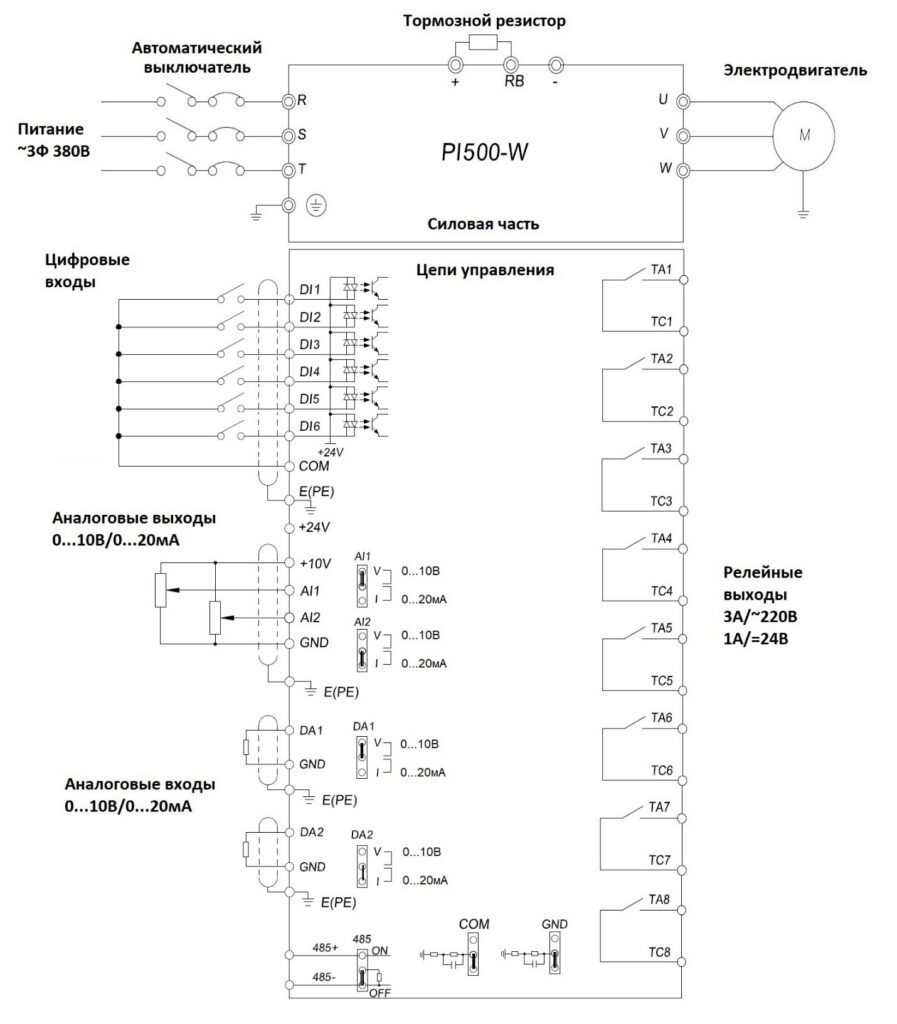 - Тормозной транзистор (тормозной прерыватель) встроен до 22кВт