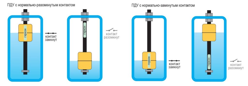 - Cостояние контактов датчика в нижнем положении поплавка: Нормально-замкнутое;