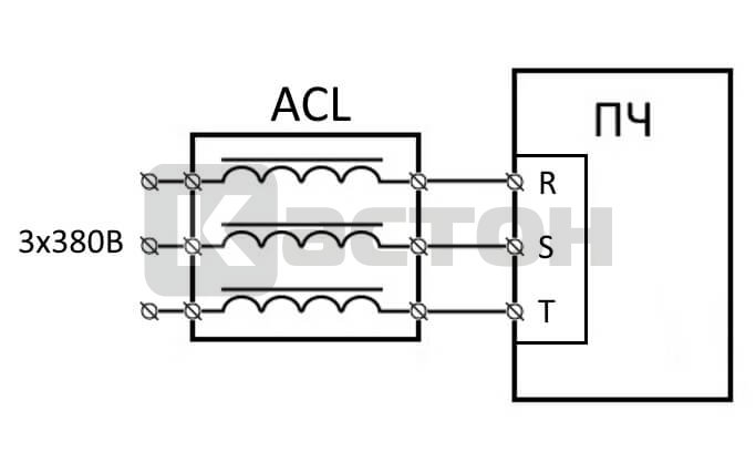 Сетевой дроссель устанавливается в цепи питания перед преобразователем частоты. Служит для сглаживания гармонических колебаний, всплесков, кратковременных просадок питающей сети. Снижает скорость нарастания токов при коротком замыкании.