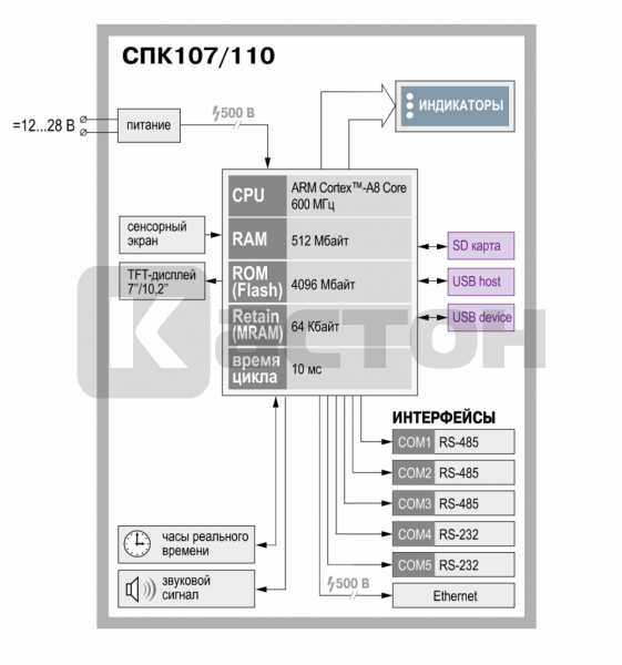 - Коммуникационные интерфейсы: Ethernet 1×10/100 Мбит/c (RJ45), 3×RS-485, 2×RS-232, USB Host, USB Device, слот для SD-карт;