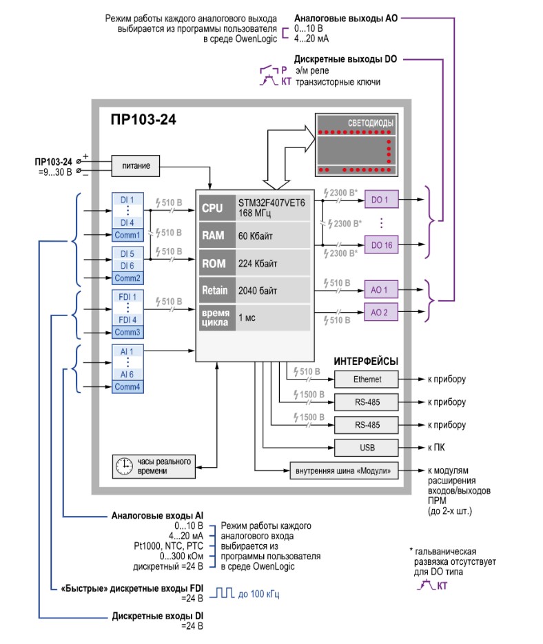 Для расширения собственных входов/выходов предусмотрено подключение по внутренней шине модулей расширения ПРМ. Написание алгоритма осуществляется пользователем на языке FBD с помощью бесплатной среды программирования Owen Logic.