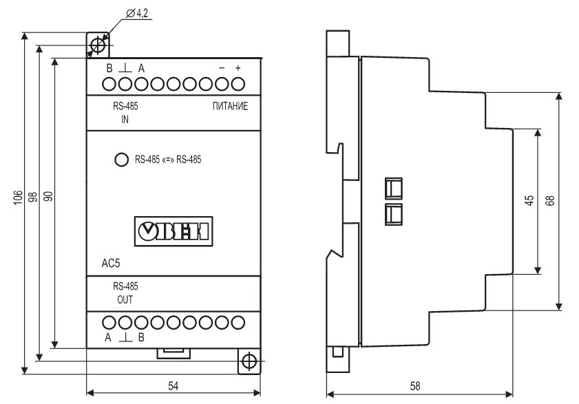 Повторитель интерфейса RS-485 ОВЕН АС5 предназначен для усиления ослабленного сигнала интерфейса RS-485 и применяется в случаях, когда количество приборов в сети больше 32-х и/или длина линии связи между приборами превышает 1200 метров.